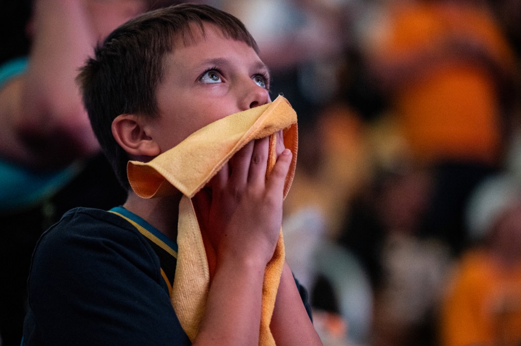 Drew Goley watches with bated breath during the Indiana Pacers Game 7 watch party June 22, 2025, at Gainbridge Fieldhouse. Credit: Nate Pappas for Mirror Indy