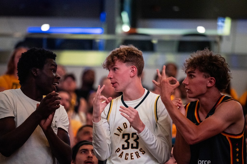 Two Indiana Pacers fans clarify the number of points scored to a fellow spectator during the Indiana Pacers Game 7 watch party June 22, 2025, at Gainbridge Fieldhouse. Credit: Nate Pappas for Mirror Indy