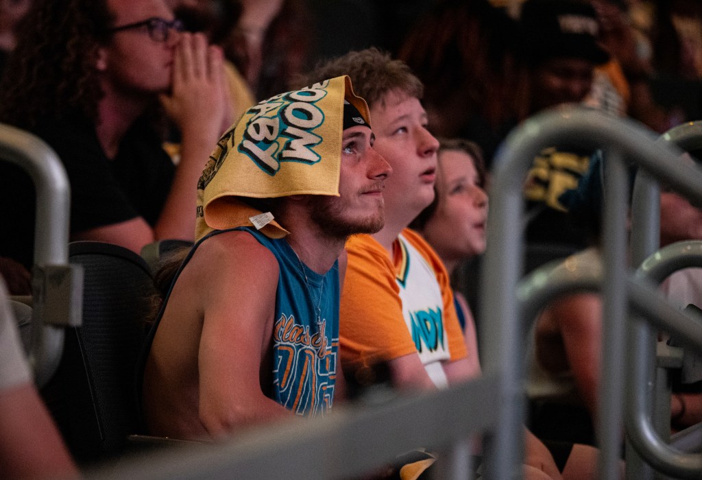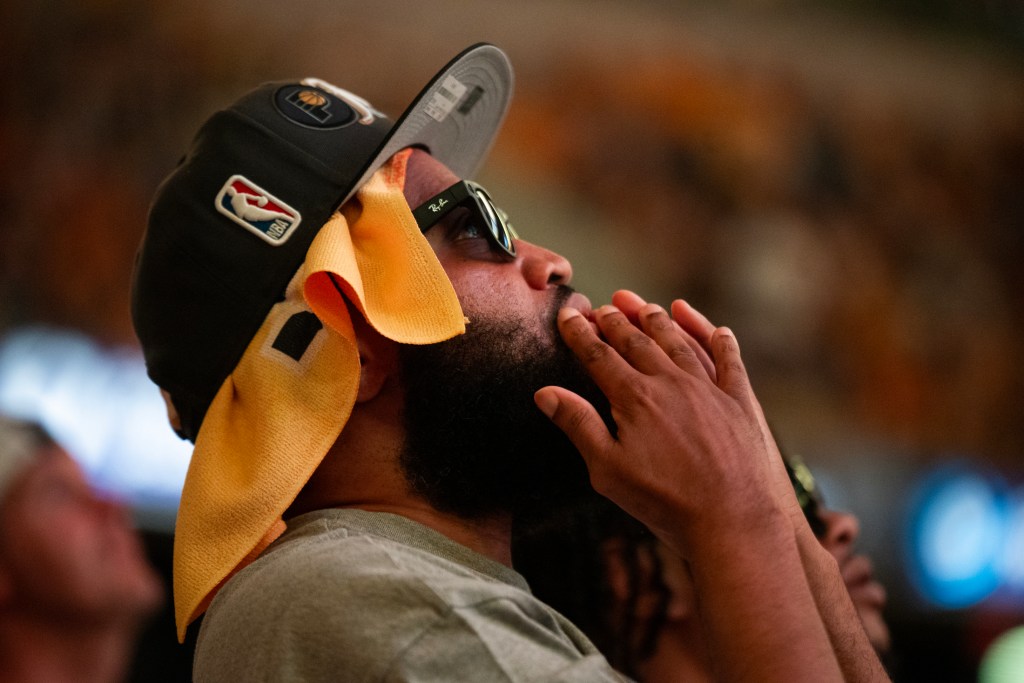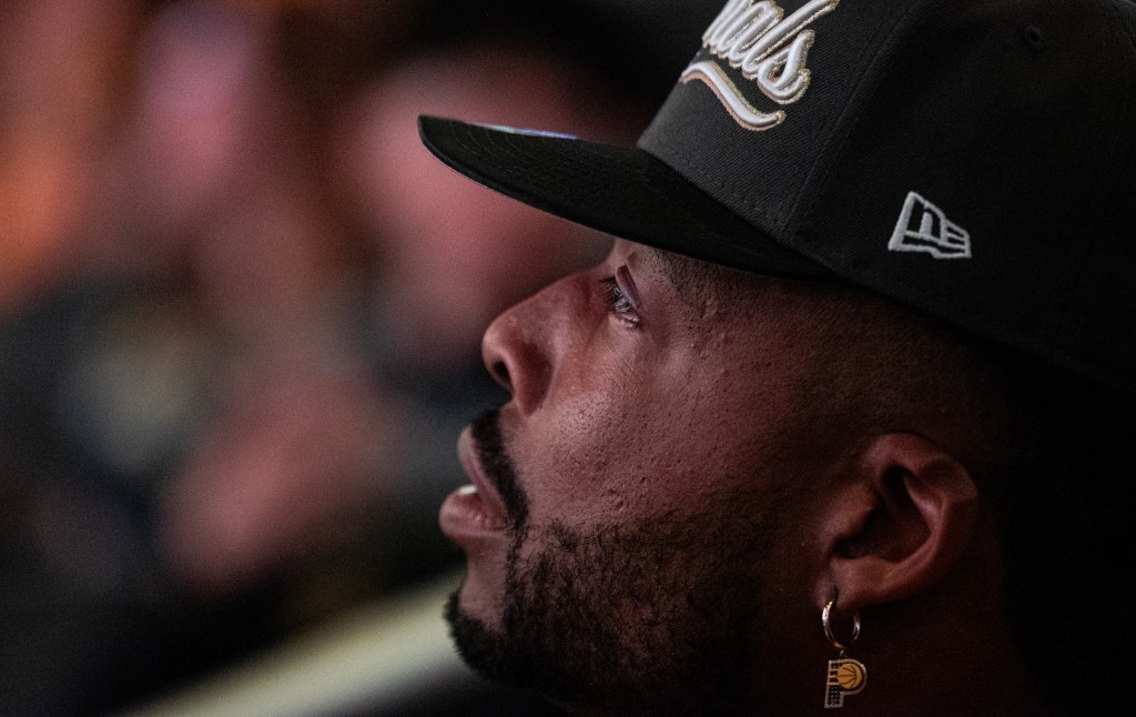 Sampson Levingston watches as the final minutes tick off the clock during the Indiana Pacers Game 7 watch party June 22, 2025, at Gainbridge Fieldhouse. Credit: Nate Pappas for Mirror Indy