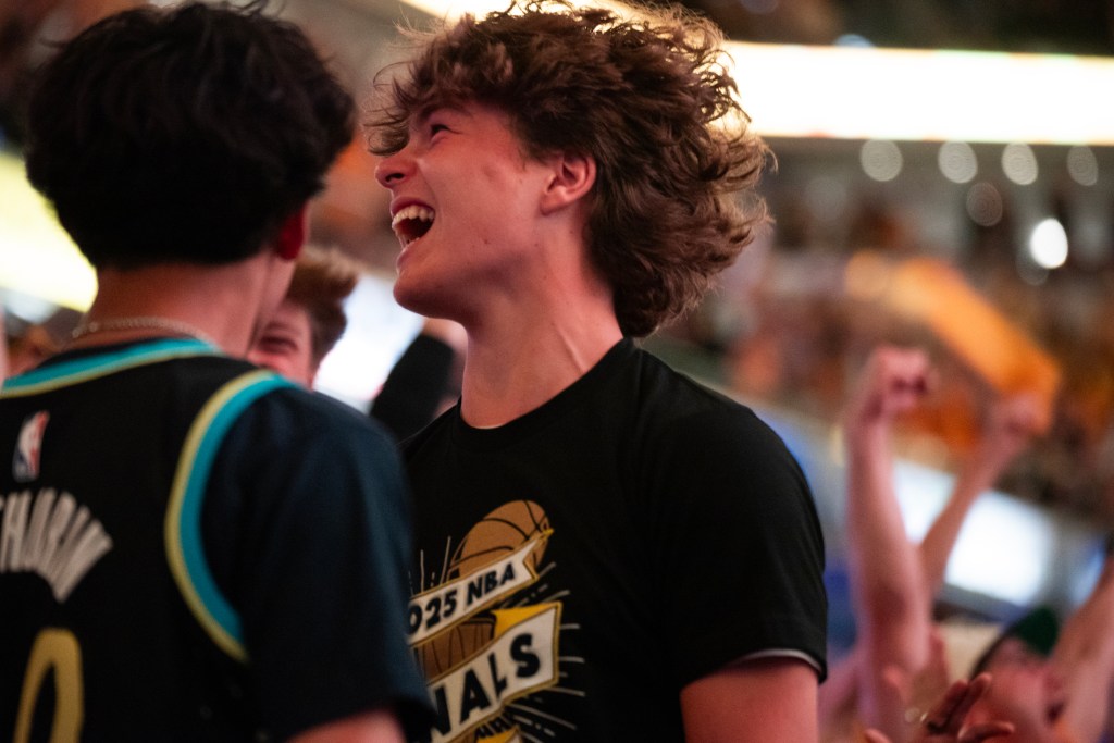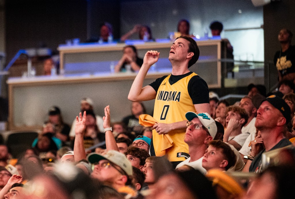 Matthew McManus celebrates an Indiana Pacers basket during the Indiana Pacers Game 7 watch party June 22, 2025, at Gainbridge Fieldhouse. Credit: Nate Pappas for Mirror Indy