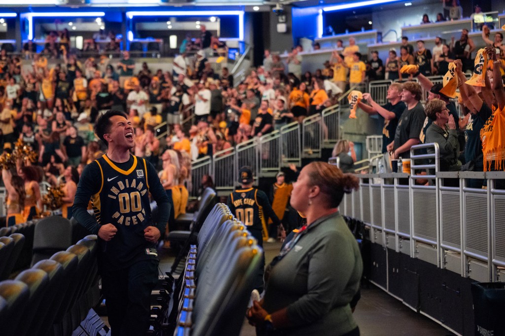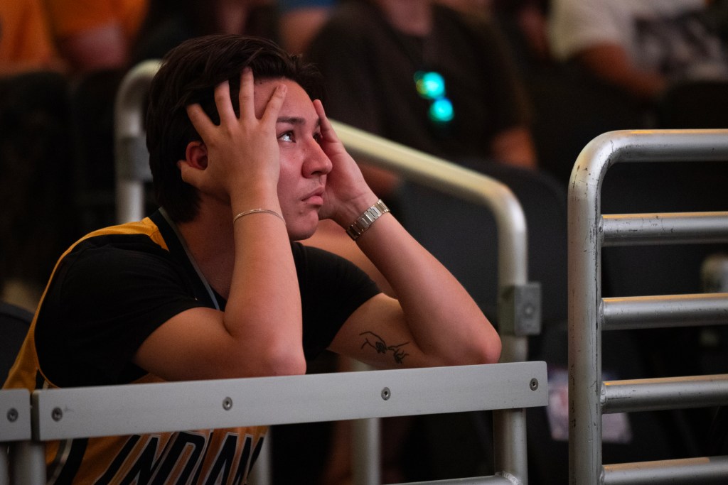 Kai Takesue reacts to Tyrese Haliburton’s game-ending achilles injury during the Indiana Pacers Game 7 watch party June 22, 2025, at Gainbridge Fieldhouse. Credit: Nate Pappas for Mirror Indy