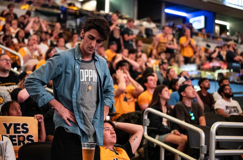 Isaac Hernandez reacts with disappointment after a play during the Indiana Pacers Game 7 watch party June 22, 2025, at Gainbridge Fieldhouse. Credit: Nate Pappas for Mirror Indy