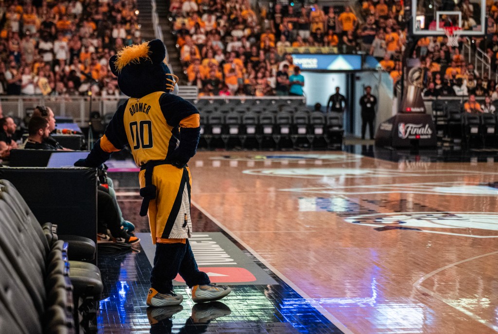 Boomer leans on the score table as he watches the game during the Indiana Pacers Game 7 watch party June 22, 2025, at Gainbridge Fieldhouse. Credit: Nate Pappas for Mirror Indy