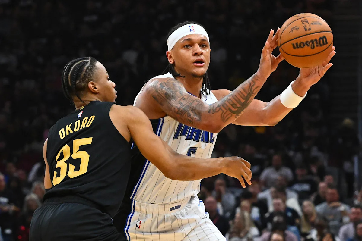 Paolo Banchero of the Orlando Magic looks to pass against Isaac Okoro of the Cleveland Cavaliers on Sunday during the second quarter of Game 7 of their Eastern Conference first-round series. (Photo by Jason Miller/Getty Images)