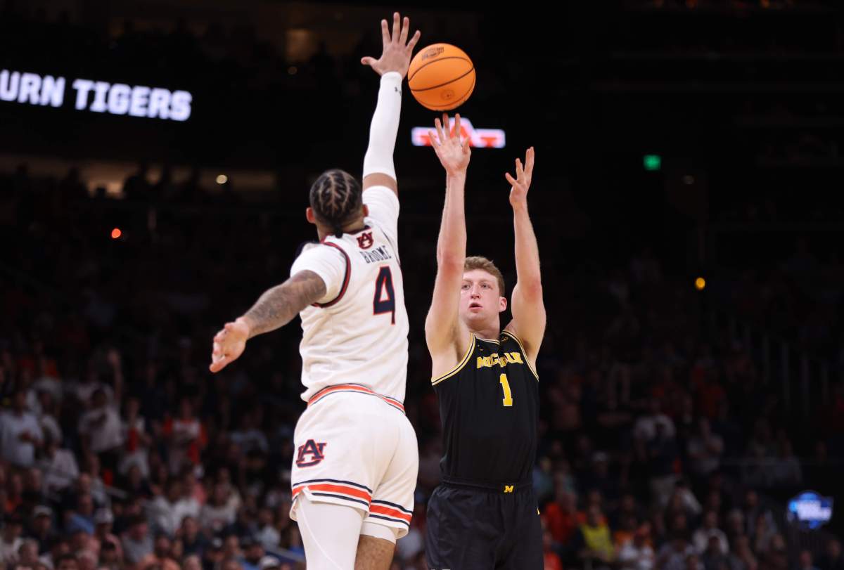 Mar 28, 2025; Atlanta, GA, USA; Michigan Wolverines center Danny Wolf (1) shoots against Auburn Tigers forward Johni Broome (4) in the second half of a South Regional semifinal of the 2025 NCAA tournament at State Farm Arena. Mandatory Credit: Brett Davis-Imagn Images