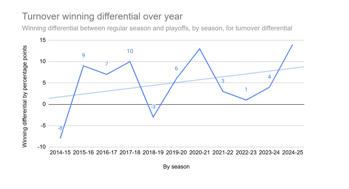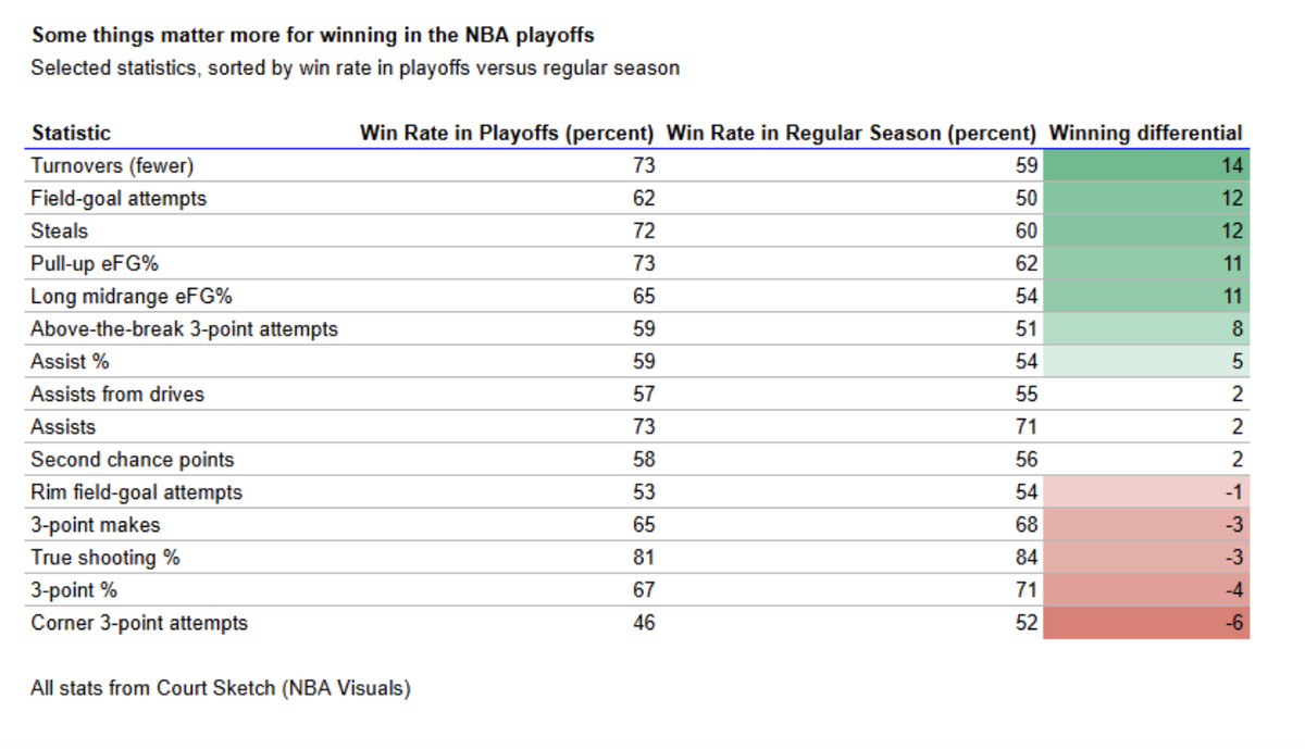 Teams that committed fewer turnovers than their opponents won 59 percent of all games in the regular season. That rose to a preposterous 73 percent in the playoffs. That gap of 14 percentage points represents the largest gap of any statistic when comparing winning differential between the regular season and the playoffs. But it’s far from the only one to have changed by a wide margin.