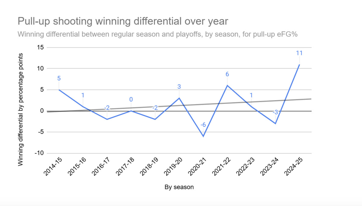 This actually continues a trend over the last several years. I was worried about the small sample size of the playoffs compared to the regular season, so I pulled the same statistics since 2014-15, when tracking data began. And while relationships do vary, the trend line has been positive, with all of pull-up efficiency, long mid-range efficiency, and above-the-break three-point attempts generally correlating more positively in the playoffs than the regular season.