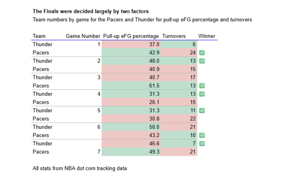 Through the Finals, any team that both had a higher eFG percentage and fewer turnovers than the other was undefeated, a perfect 4-0. (Translation: The league never should have led the Thunder pair Caruso with Gilgeous-Alexander.)
