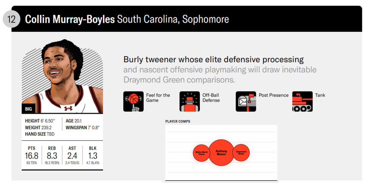 Murray-Boyles’ toughness, unselfishness, defensive versatility and playmaking give him a high floor, even if his lack of size and perimeter shooting might make him a situational fit in certain lineup configurations.”