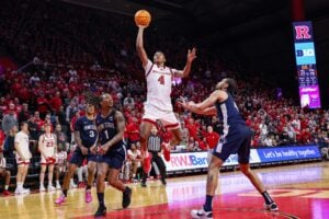 Dec 10, 2024; Piscataway, New Jersey, USA; Rutgers Scarlet Knights guard Ace Bailey (4) goes to the basket asPenn State Nittany Lions guard Freddie Dilione V (4) and guard Ace Baldwin Jr. (1) defend during the second half at Jersey Mike’s Arena. Mandatory Credit: Vincent Carchietta-Imagn Images