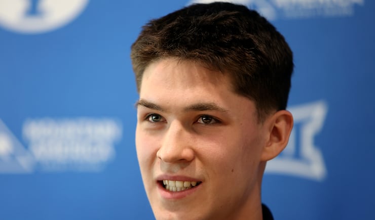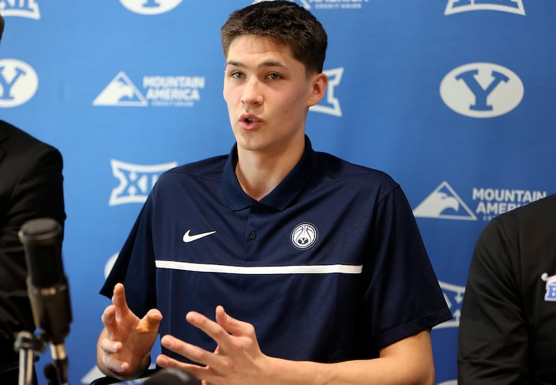 BYU point guard Egor Demin talks during a press conference about his plans to enter the NBA draft at the Marriott Center Annex in Provo on Tuesday, April 8, 2025. | Kristin Murphy, Deseret News