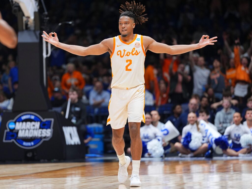 Tennessee guard Chaz Lanier (2) celebration after hitting a 3-point basket during the Sweet 16 game against Kentucky in the NCAA college basketball tournament on Friday, March 28, 2025, in Indianapolis, IN.
