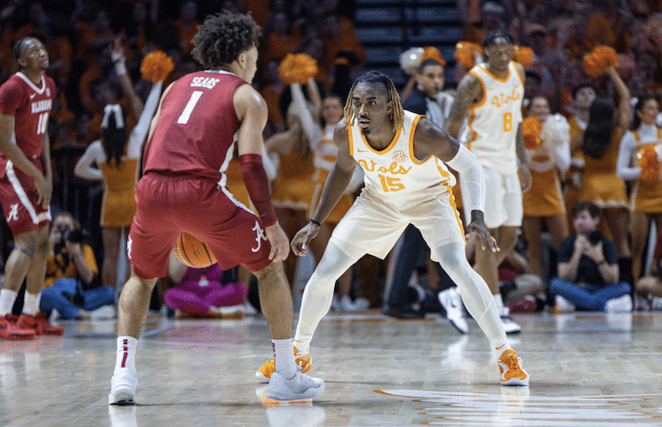 Jahmai Mashack (15) defends an Alabama guard during a game at Food City Center. Saturday, March 1, 2025. Cole Moore/RTI