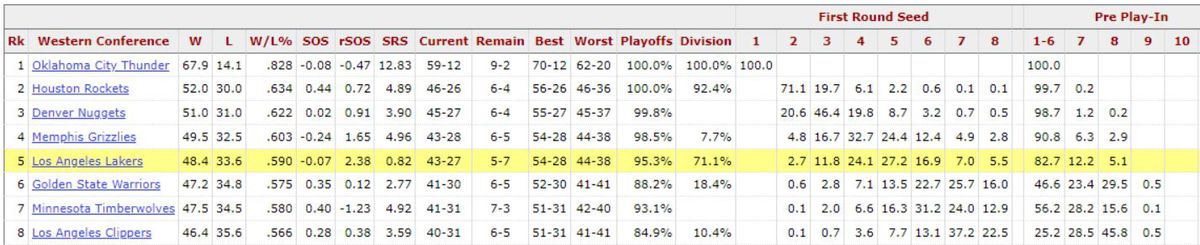As of March 24, Basketball-Reference simulates that the Lakers will make the playoffs around 95% of the time: