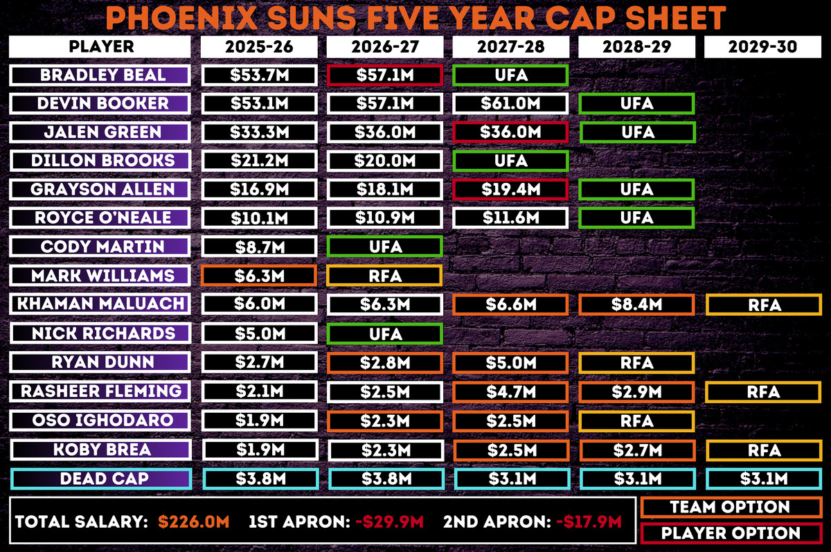 If the Suns don’t get under that second apron, this will mark their second consecutive year above it. And, if they were to remain above it going into 2026-27, that would trigger a cap penalty with real, long-term consequences: namely, their 2033 first-round pick would be frozen and pushed to the back of the round. That may sound like a distant problem, but for a team already depleted of draft capital, it’s a ticking time bomb.