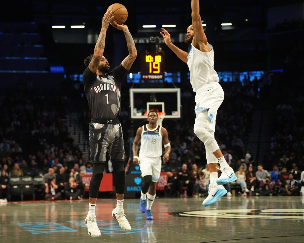 Apr 3, 2025; Brooklyn, New York, USA; Brooklyn Nets guard D’Angelo Russell (1) shoots a three point jump shot against the Minnesota Timberwolves during the first half at Barclays Center. Mandatory Credit: Gregory Fisher-Imagn Images