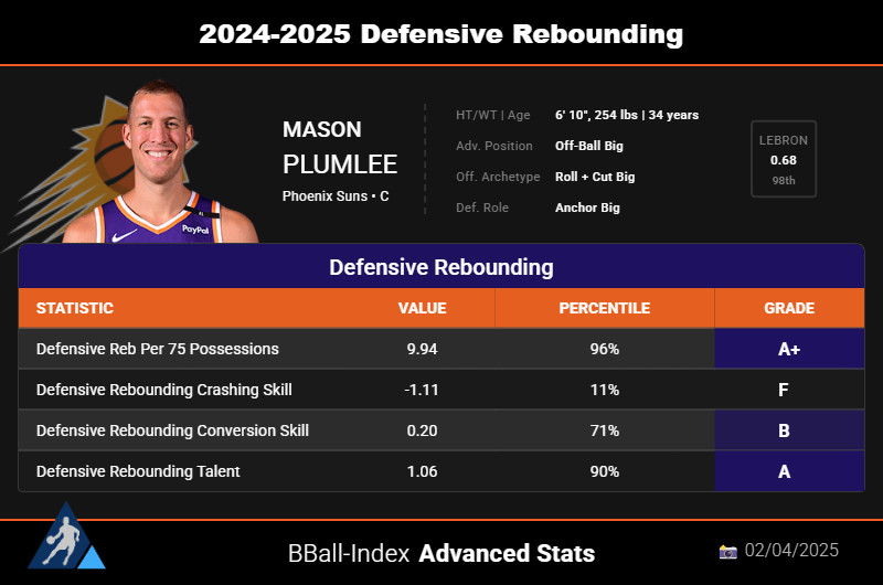 For all his faults this season — and there are plenty — defensive rebounding is one area where Jusuf Nurkic thrives. The numbers back it up, as do the advanced metrics. He ranks 16th in the NBA with 7.3 defensive rebounds per game, and his defensive rebounding talent sits in the 100th percentile, earning an A+ grade.