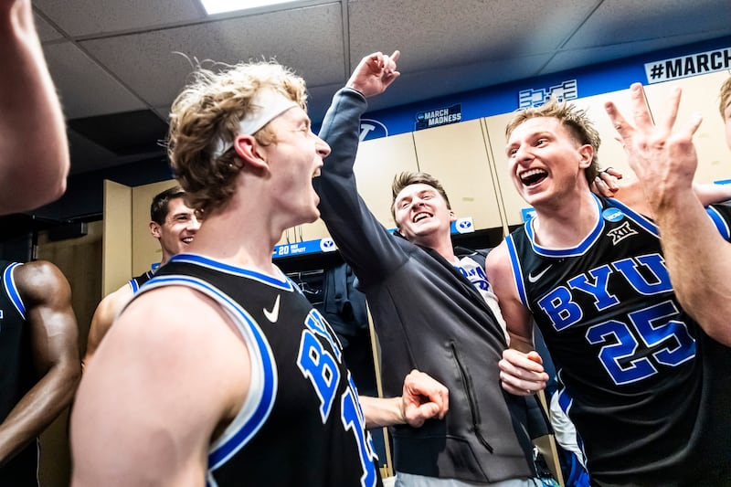 BYU guard Jared McGregor (center) celebrates with teammates Richie Saunders (left) and Dawson Baker (right) following BYU’s NCAA Tournament victory over Wisconsin on March 22, 2025, in Denver. | Nate Edwards
