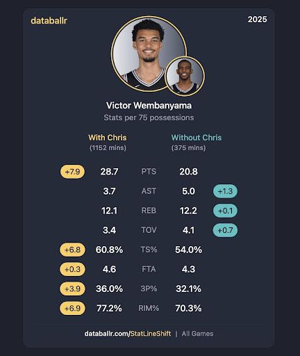 Paul’s impact on Victor Wembanyama was undeniable. The graphic below shows that without CP3 on the court, Wemby’s statistics were markedly worse in most areas.