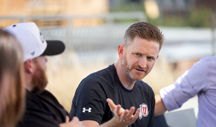 Alex Jensen, men’s basketball head coach of the Utah Utes, speaks to members of the media at an informal gathering at the university in Salt Lake City on Wednesday, June 25, 2025. | Laura Seitz, Deseret News
