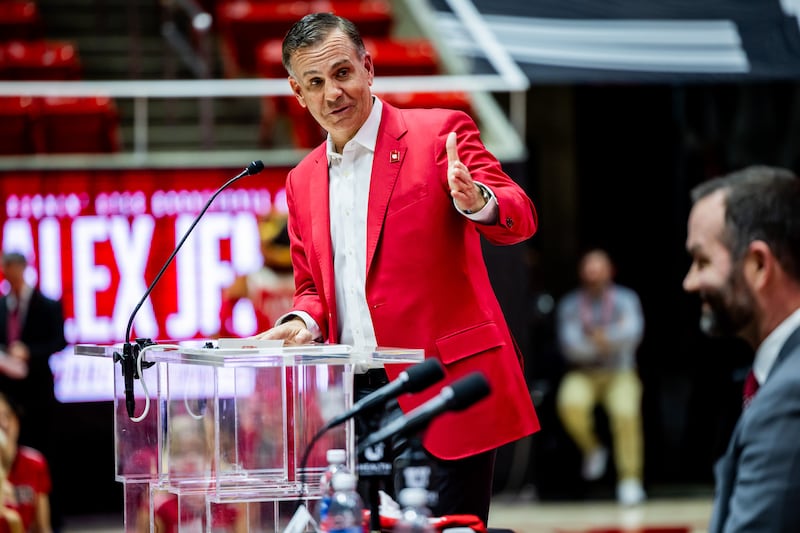 Utah Director of Athletics Mark Harlan speaks at a press conference to introduce Alex Jensen, right, as the new head coach for the University of Utah men’s basketball team at the Jon M. Huntsman Center in Salt Lake City on Monday, March 17, 2025. | Tess Crowley, Deseret News