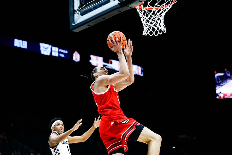 Utah forward Keanu Dawes, right, drives to the hoop against Butler during a first-round game at the College Basketball Crown at MGM Grand Garden Arena in Las Vegas on Monday, March 31, 2025. | Anna Fuder, Utah Athletics Utah’s first schedule under Alex Jensen
