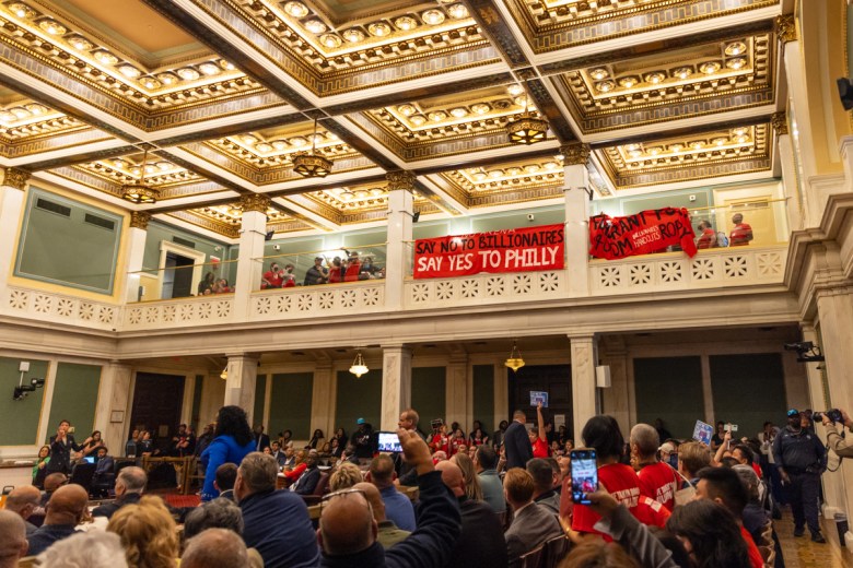 Protesters disrupted Philadelphia City Council as Sixers arena legislation was introduced on October 24, 2024. (Kimberly Paynter/WHYY)