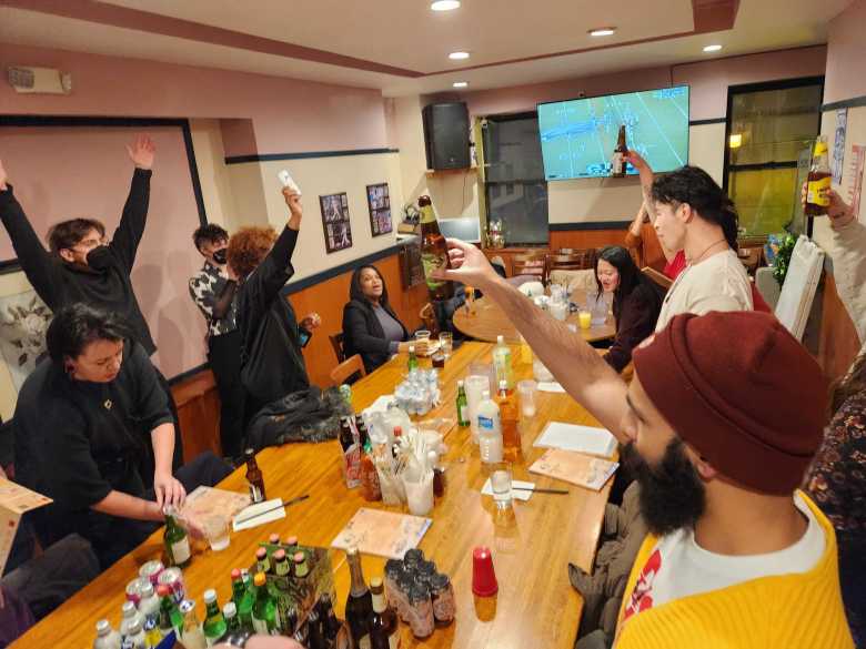 Members of No Arena in Chinatown Solidarity (NACS) toasted to the news that the Sixers arena would not come to Center City at a celebration at Little Saigon Cafe. (Heather Chin/Billy Penn)