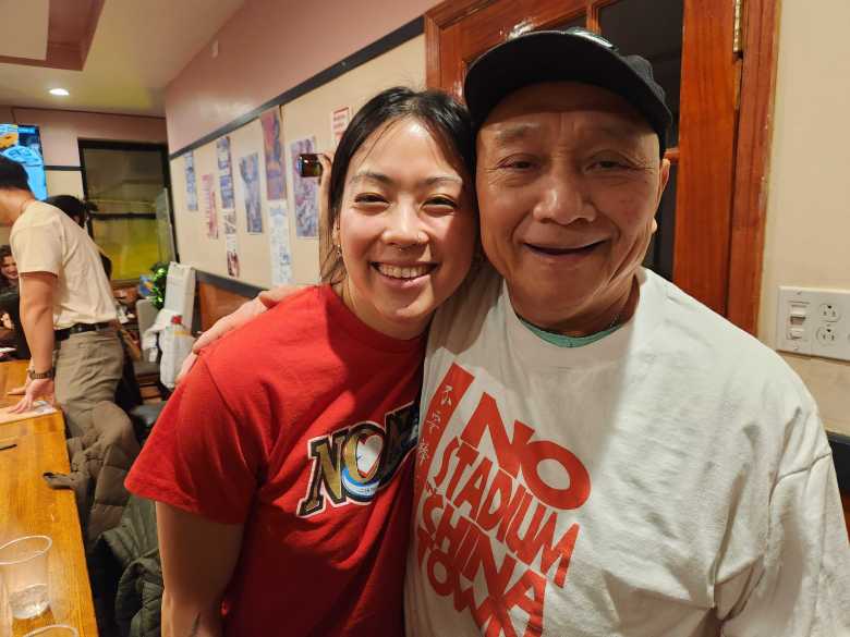 Claire So of NACS and Sam Sam of Little Saigon Cafe celebrated the news that the Sixers arena would not come to Center City. (Heather Chin/Billy Penn)