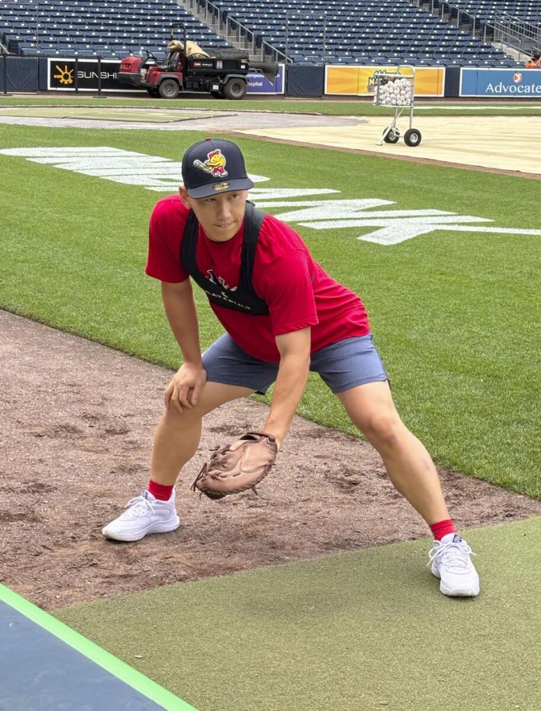 Wearing a first baseman’s glove, Masataka Yoshida takes grounders during a defensive drill on July 2 in Worcester, Massachusetts. (KYODO)