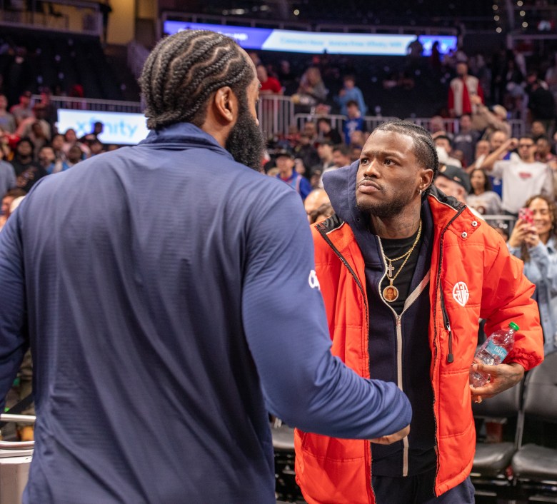 Comedian DC Young Fly greets James Harden of the Los Angeles Clippers after an NBA game against the Atlanta Hawks on Friday, March 14, 2025 at State Farm Arena in Atlanta, Georgia. (Photo: Itoro N. Umontuen/The Atlanta Voice)