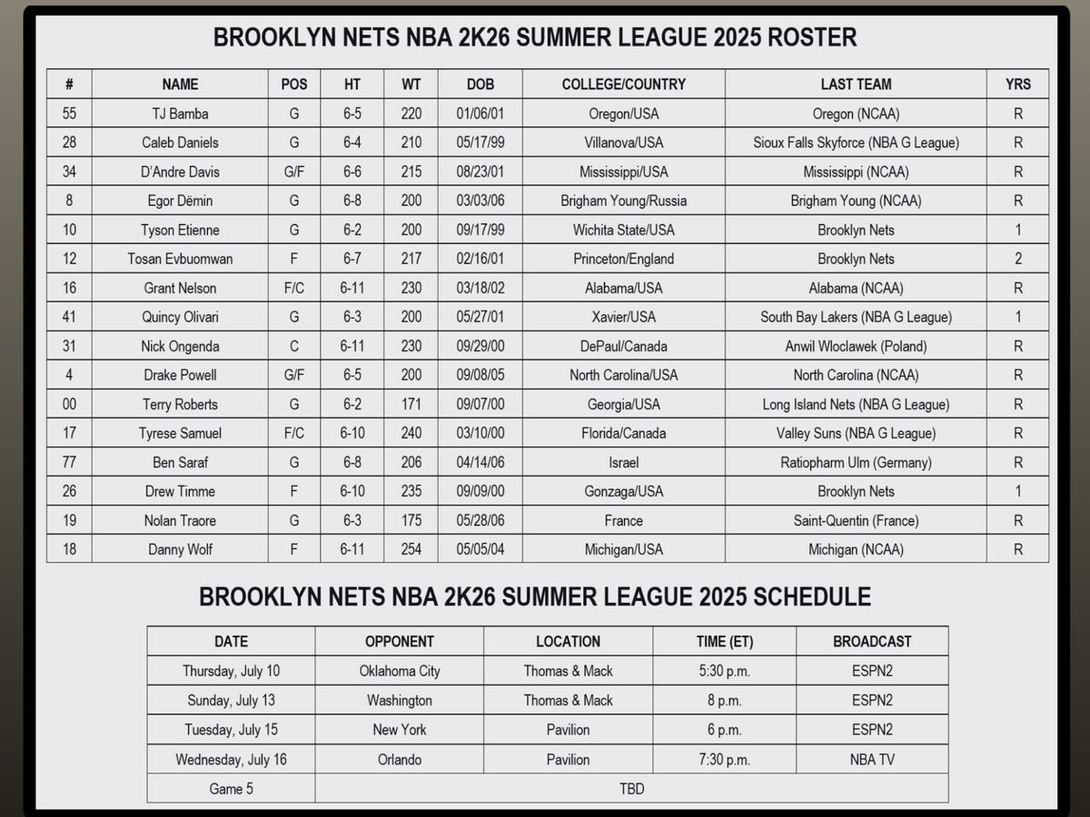 Not on the roster: Dariq Whitehead and Noah Clowney, the Nets two 20-year-olds. Third-year players do not typically participate in Summer League.