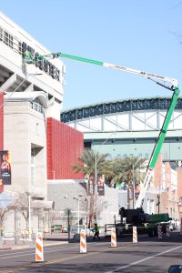 Workers remove the Footprint Center signage from the home to the Phoenix Suns and Mercury in downtown Phoenix. (Photo by Jace Grenke/Cronkite News)