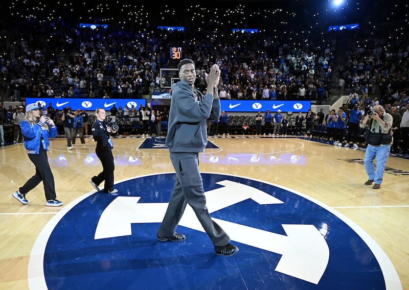 AJ Dybantsa, the nation’s No. 1 basketball recruit, is presented at halftime of the BYU and Fresno State game at the Marriott Center in Provo on Wednesday, Dec. 11, 2024. | Scott G Winterton, Deseret News