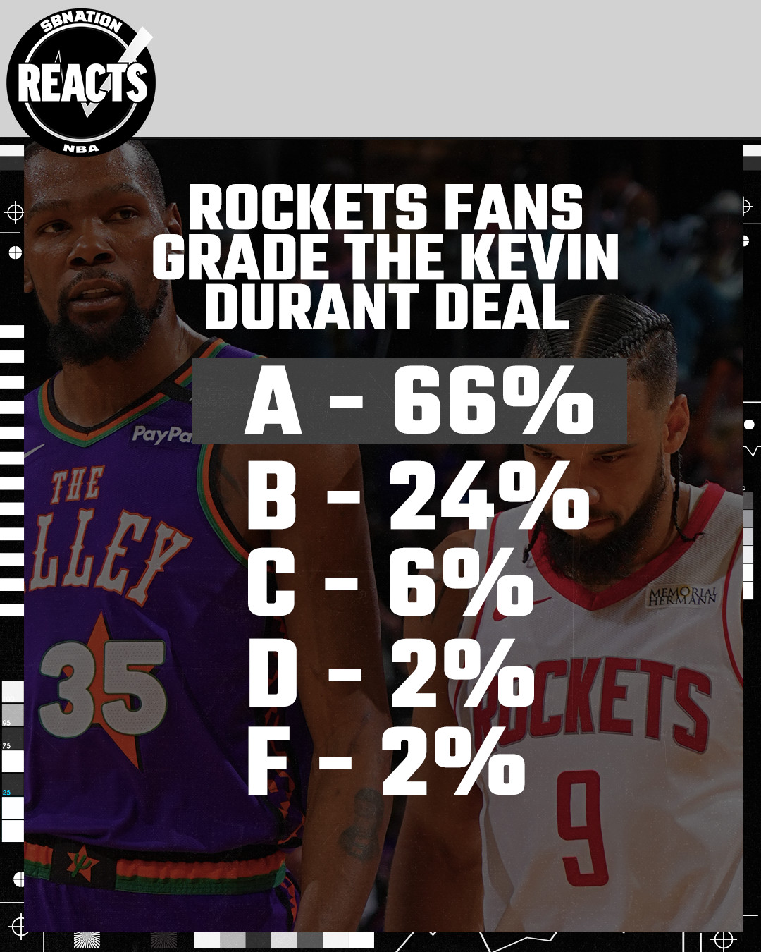 As you can see, 90 percent of readers gave the trade an A or a B, with 66 percent scoring an A. I voted for a B, though if we could get more accurate, I would’ve said B- for my final grade. We’ve been over this ad nauseum: I’m glad Houston GM Rafael Stone didn’t give up much of the Rockets’ future in this deal, but I’m not convinced KD is that guy at this point in his career. I’m more than happy to be wrong.