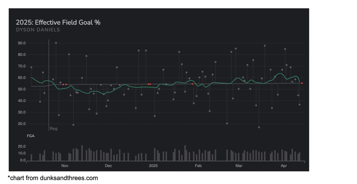 Dyson Daniels has had a spectacular season so far. The defensive clinic that he’s put on this season will undoubtedly earn him consideration for both the Defensive Player of the Year and Most Improved Player awards this season. His offense, which was a significant question mark entering the season, has been better than expected, and his scoring efficiency has been trending up for most of the season.