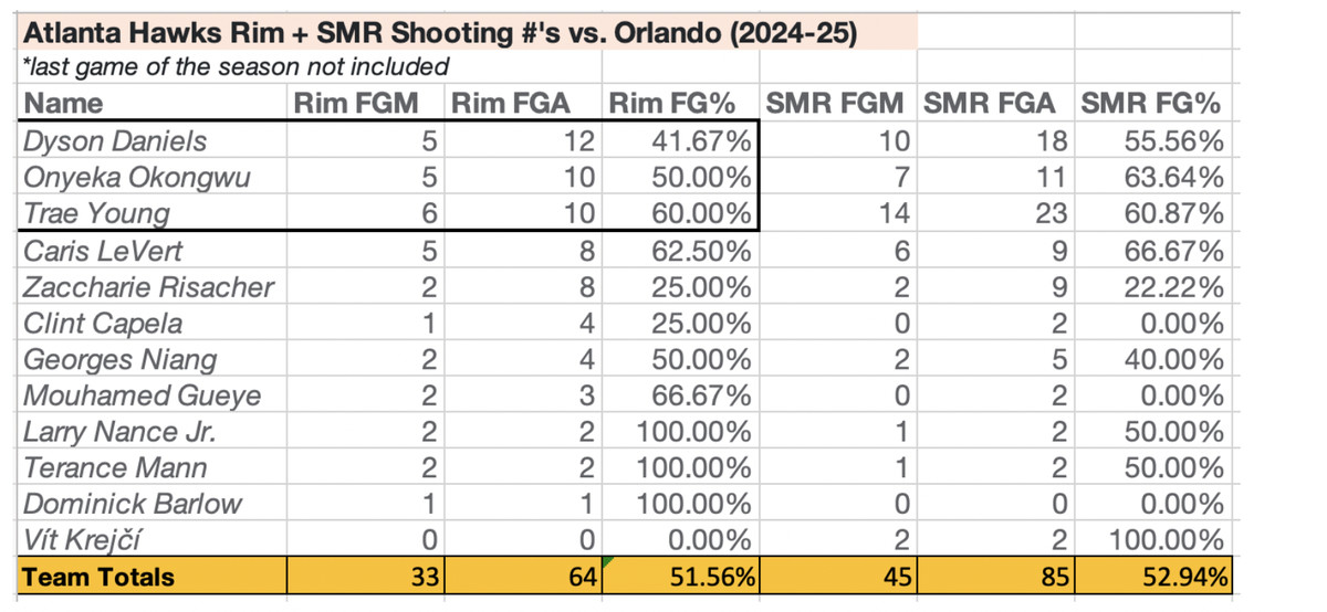 Per pbpstats, in the three meaningful games they played against Orlando this season, the Hawks shot 45-for-85 (52.9%) from floater range and a disastrous 33-for-64 (51.6%) at the rim.