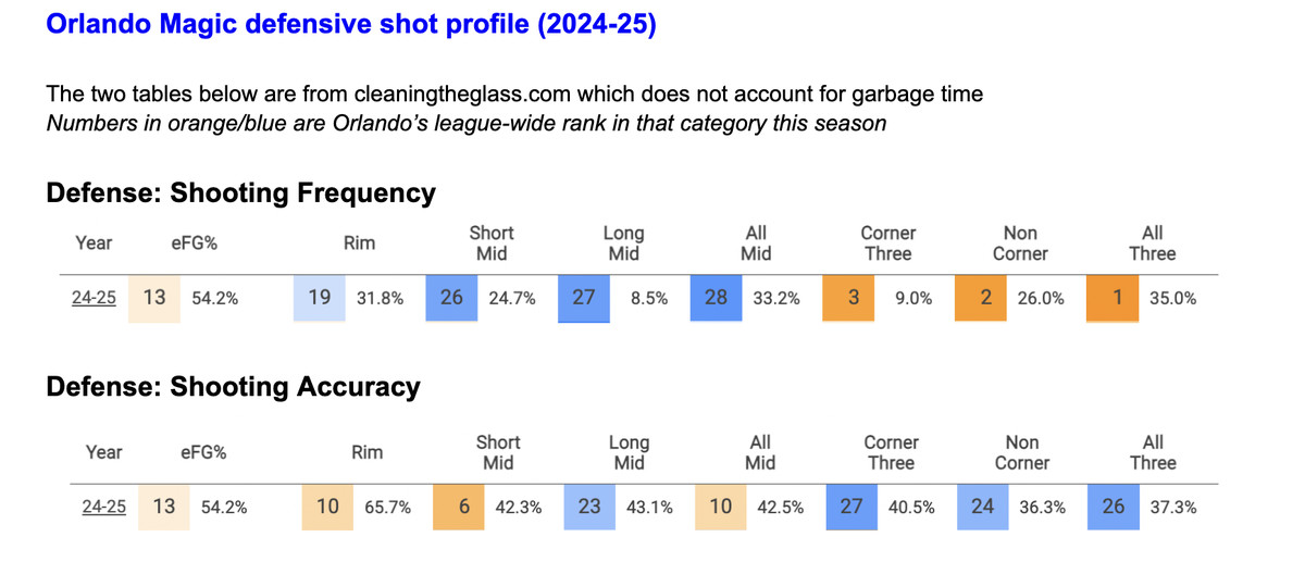 While the Magic like to pressure opposing ball handlers — and they force turnovers at the second-highest rate in the league — another critical component of their defensive strategy is to take away the three ball and funnel their opponents to the interior as you can glean from their defensive shot profile below.