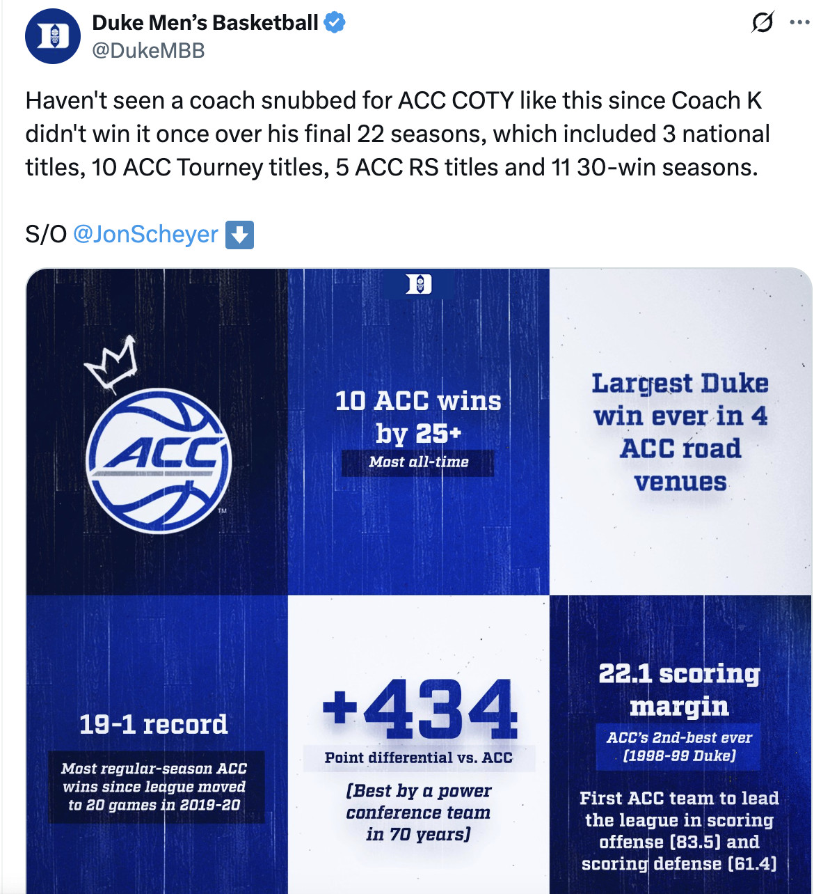 —The official Duke men’s basketball Twitter accounts made multiple highly juvenile tweets complaining about Louisville’s Pat Kelsey winning ACC Coach of the Year over Jon Scheyer (which he did by a wide margin) and Louisville’s Chucky Hepburn winning ACC Defensive Player of the Year over Cooper Flagg.