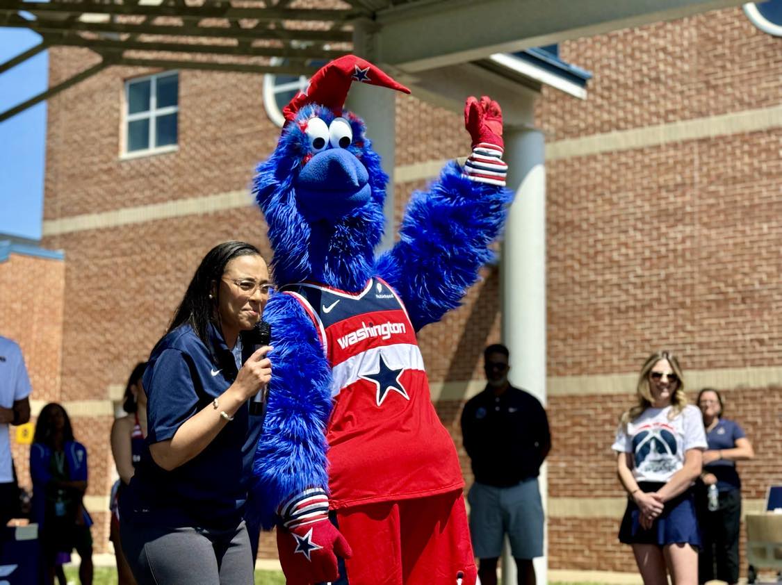 ACPS Superintendent Melanie Kay-Wyatt with G-Wiz, the Washington Wizards mascot, at Samuel W. Tucker Elementary School, Aug. 23, 2024 (staff photo by James Cullum)
