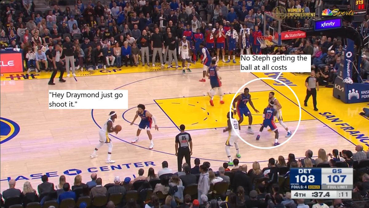 In an alternate universe, Schröder’s institutional knowledge may have been enough to get the Pistons the win. There was no real defensive breakdown; the Pistons stuck to the coverage plan that — for most of the night — “worked,” in the sense that Curry had an inefficient (by his astronomical standards) 32 points, all of which he was made to work for in the face of copious ball denial and top-locking.