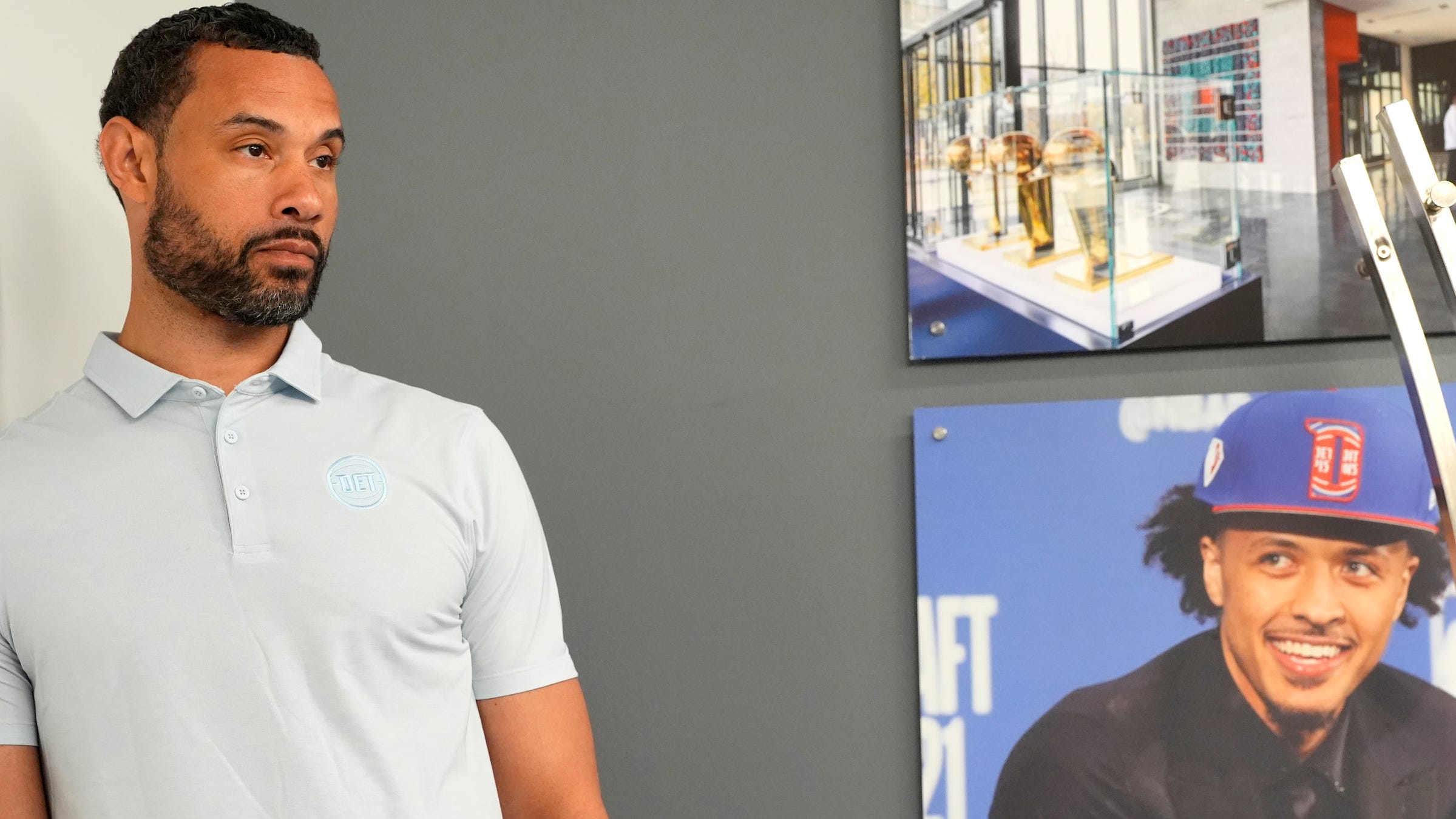 Detroit Pistons president of basketball operations Trajan Langdon discusses offseason acquisitions and next season’s outlook July 8, 2025 in Detroit.