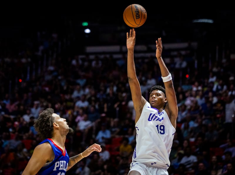 Utah Jazz forward Ace Bailey (19) puts up a 3-pointer shot during a NBA Salt Lake City Summer League game between the Utah Jazz and the Philadelphia 76ers at the Jon M. Huntsman Center on the campus of the University of Utah in Salt Lake City on Saturday, July 5, 2025. | Brice Tucker, Deseret News