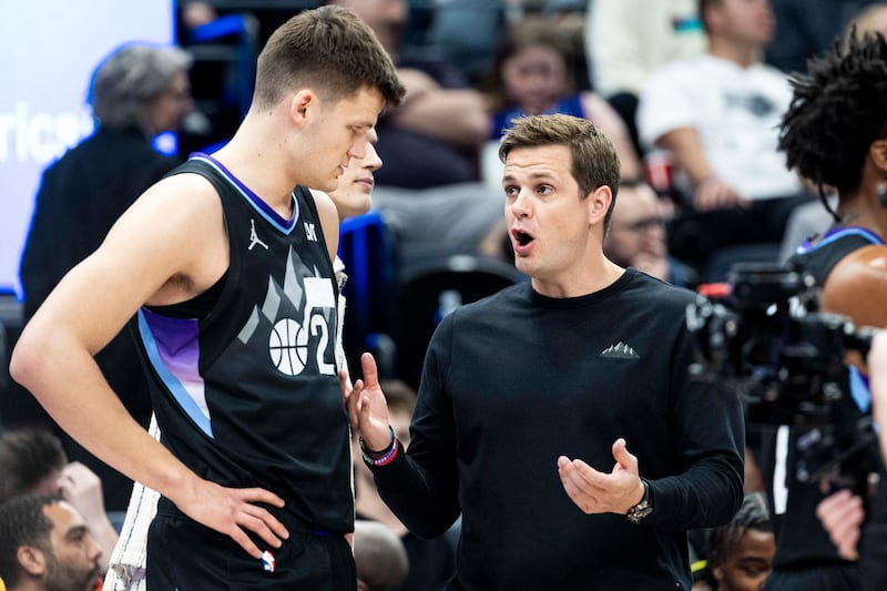 Utah Jazz head coach Will Hardy talks with center Walker Kessler (24) during an NBA basketball game against the Minnesota Timberwolves held at the Delta Center in Salt Lake City on Friday, Feb. 28, 2025. | Isaac Hale, Deseret News