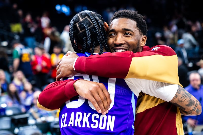 Cleveland Cavaliers guard Donovan Mitchell hugs Utah Jazz guard Jordan Clarkson after a game at the Delta Center in Salt Lake City on Sunday, March 23, 2025. | Tess Crowley, Deseret News