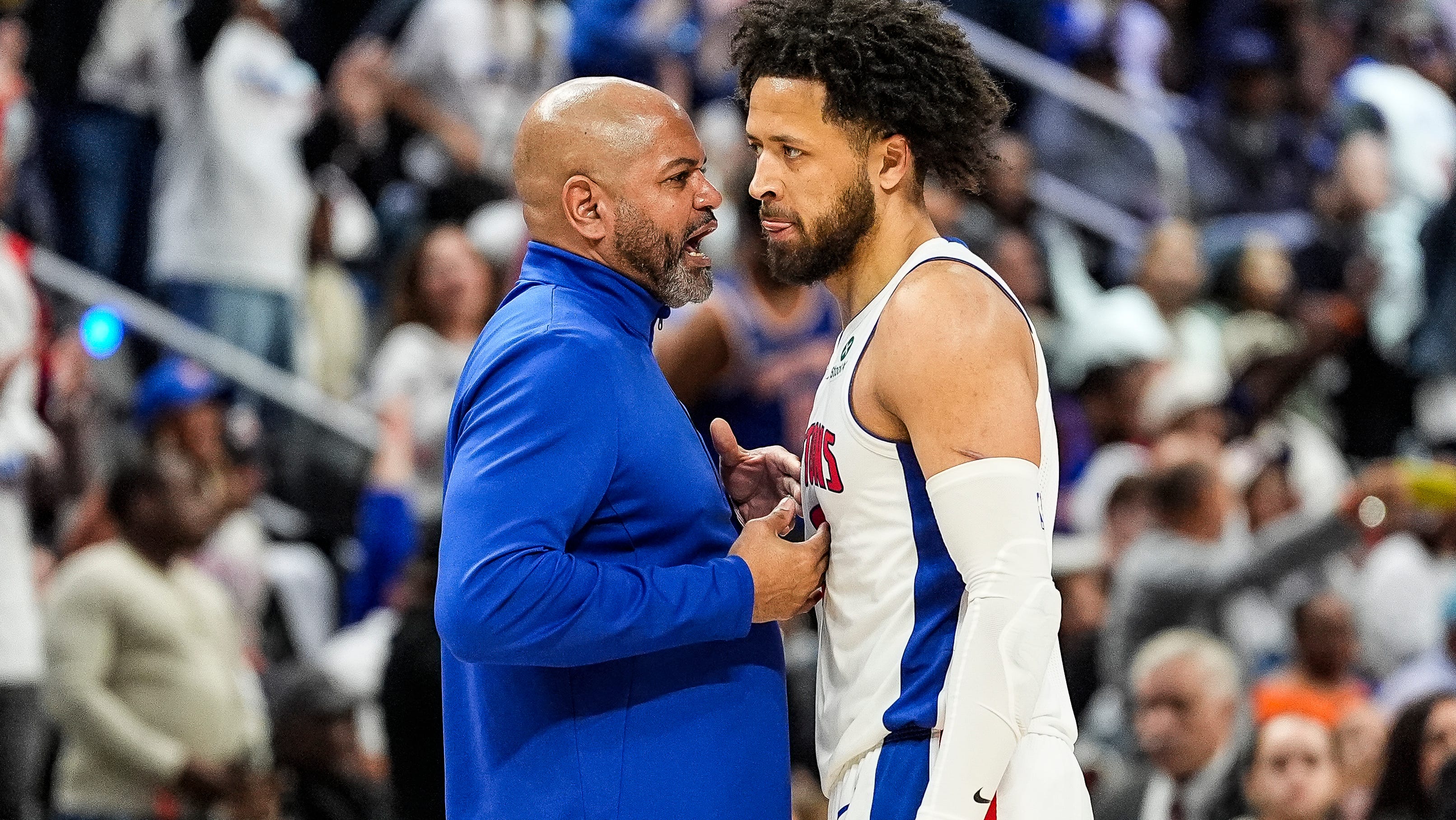 J.B. Bickerstaff reacts to Detroit Pistons season-ending loss to New York Knicks in Game 6 of NBA playoffs May 1, 2025 at Little Caesars Arena.