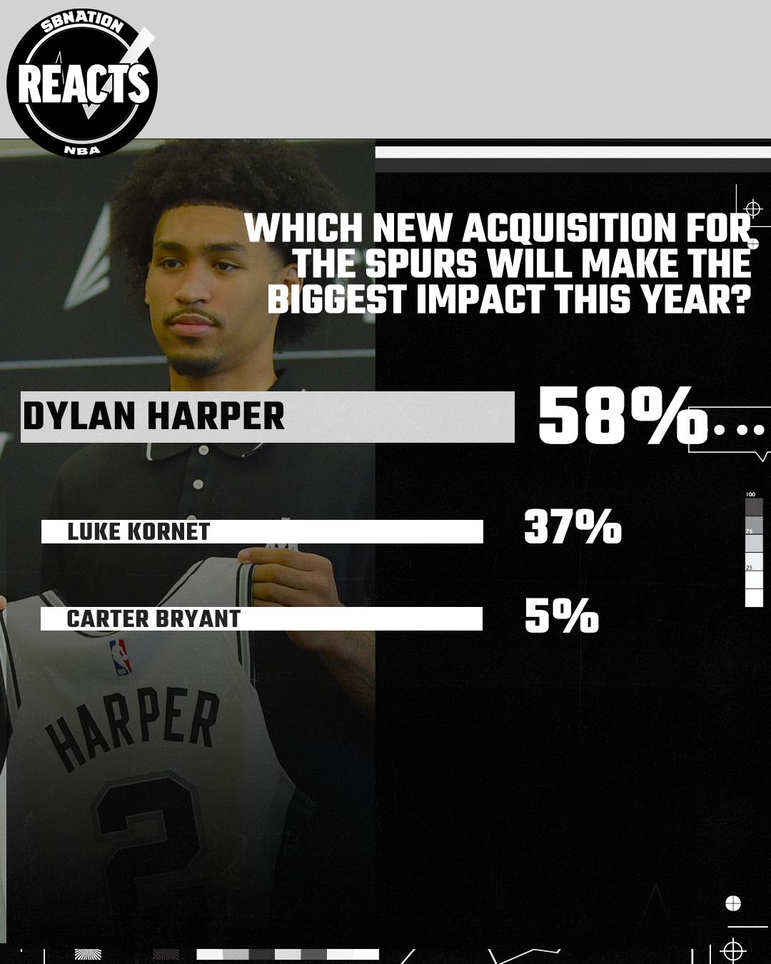 Harper was the unanimous favorite, with Luke Kornet coming in second. Kelly Olynyk is notably missing from the poll, as it was created before the Spurs traded for him. There weren’t many comments boasting him as a key player on next year’s team, however.