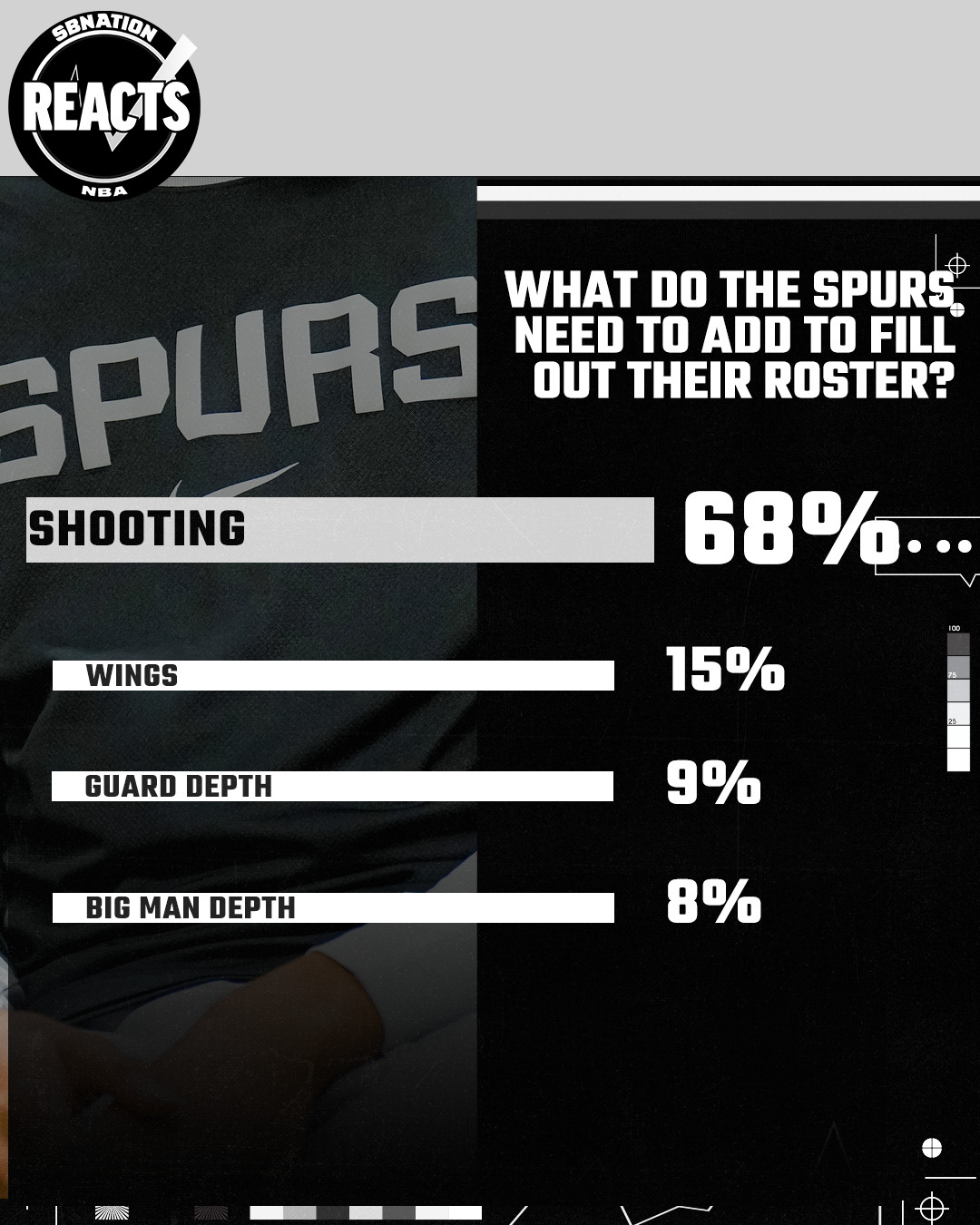 With two more roster spots to fill, the Spurs could use a bit more shooting, according to the survey. There are options out there. They could kick the tires on some old Spurs like Patty Mills, Doug McDermott, Trey Lyles, or Lonnie Walker. Veteran options like Malcolm Brogdon, Amir Coffey, Landry Shamet, and Torrey Craig are still available. San Antonio could look internally at their summer league team and sign the hot-shooting David Jones-Garcia or Riley Minix to full team deals to fill out the rest of the team.