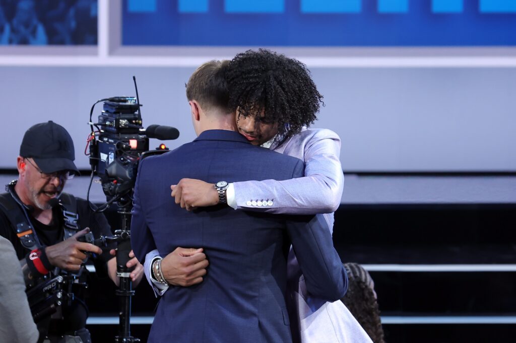 Jun 25, 2025; Brooklyn, NY, USA; Cooper Flagg embraces Asa Newell after being selected as first overall by the Dallas Mavericks in the first round of the 2025 NBA Draft at Barclays Center. Mandatory Credit: Brad Penner-Imagn Images