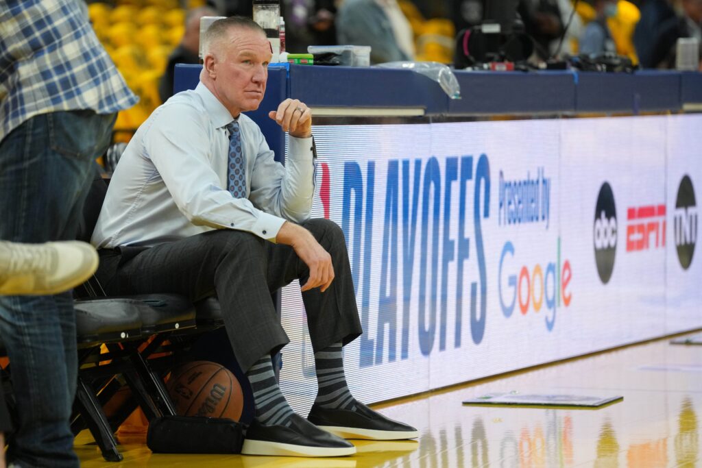Apr 26, 2025; San Francisco, California, USA; Golden State Warriors former player Chris Mullin sits courtside before game three of first round for the 2024 NBA Playoffs at Chase Center. Mandatory Credit: Darren Yamashita-Imagn Images